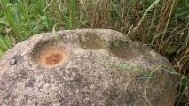 The approx. 70 cm high stone stands next to the entrance to house number 62 in the village of Hindenburg near Templin. The stone has 4 fairly large cup-marks on the top.