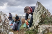 Volunteers restore the hut circles as part of works by the Holy Island Landscape Partnership. The remains of approximately 50 farmstead buildings, comprising some round houses which would have had timber roof struts with turf or thatch over them, partly subterranean storage sheds, cattle shelters and work shops. The site covered between 6 and 8 hectares and was in use from between 500 BC until post Roman times.