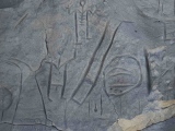 Brown & Chappell describe this as a large boulder measuring 2.7 x 2.1m which has on its sloping surface a series of vertical pecked lines and pecked circles. Even with the aid of the diagram I could not see the motifs indicated by the book. Its not that I could not see anything, its just that lines that I could see didnt seem to match those from the book. Have posted images that I took to see if others can make anything out of them.