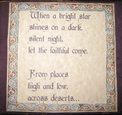 …bear with me, or check back in a couple of days. I need to blog about holiday shopping and why I do NOT like buying or receiving gifts. But right now I need to figure out how much "bling" one page can bear…I bought all these adhesive jewels but I don't want to overwhelm the story and defeat my own message about the meaning of the holidays. I wrote this story four days after 9/11 and I thought for sure publishers would want a story that promotes unity and compassion…I envisioned the Dillons creating these dreamy illustrations—in my mind, I had it all worked out. Now I'm finally moving on to Plan B. Should there be a space between these two passages? Does the silver border enhance the silver & rhinestone star, or does it look too sleek compared to the antique-y feel of the opposite page? Should I add smaller adhesive stars to the night sky or save them for the sea-scene on the next page?