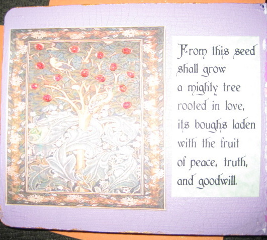Still waiting to see how my globs of orange glitter look when they're dry…I'm expecting they'll flatten out; then I'll think about how to add orange scent. The parchment paper is green, but you can't really tell in this photo. Am hoping to find gold braid or ribbon that I can use to frame the text and image…