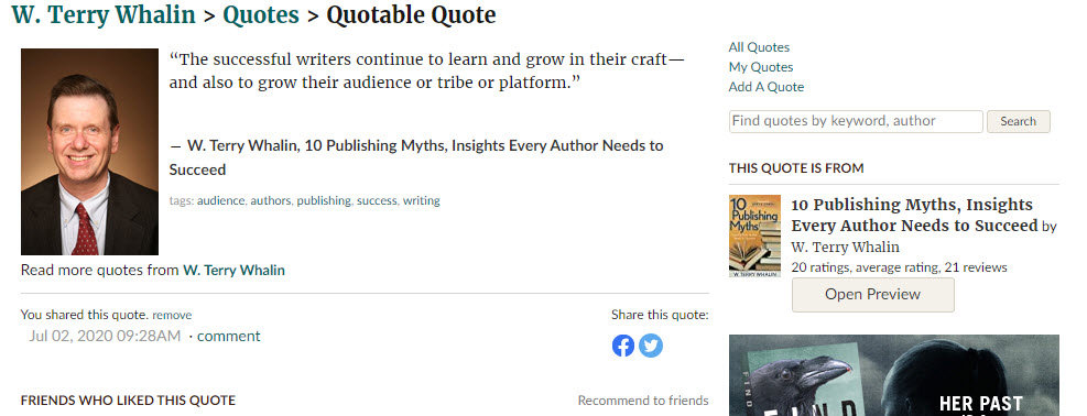 3. Promote your new quote. You've just added this quotation to a sea of other quotations. How will anyone know about it if you don't promote it? Use this link to see the quotations I've added on Goodreads. Some of these quotes are from Book Proposals That Sell and others are from 10 Publishing Myths . To see this promotion portion (an important part of the process), let's look at one of my quotations (follow this link). You will notice buttons to share the quote on Facebook or Twitter. Below these buttons, there is a link to recommend the quotation to your friends (follow this link to see it).