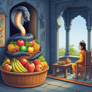 Parikshit then built a tower with no doors and windowsand stayed in it. Many rishis, even from far-off places, arrived to treat himif the need arose. However, Takshaka found a way to hide in a basket of fruitscarried by the rishis. When Parikshit grabbed a fruit, Takshaka rose from the basketand bit the king, ending his life as per the curse.