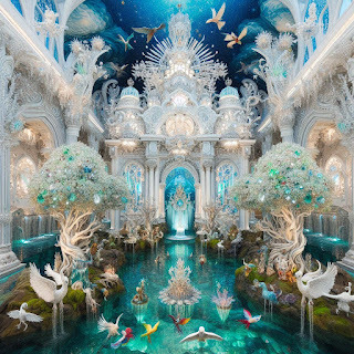 The Sabha is surrounded by celestial trees withgemstones, lovely blooms, and fruits. Plants of all colors - turquoise, yellow,black, purple, white, and red can be found in this Sabha. Exotic birds are alsoa part of it. The sweet melodies of the birds fill the Sabha.