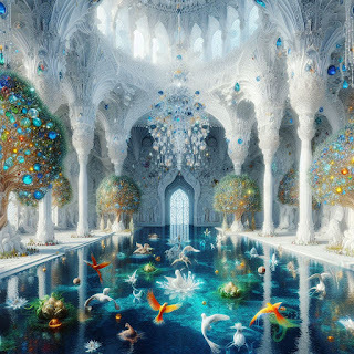 Varuna is the god of rain, water, ocean, seas,rivers, etc. His Sabha is called Pushkaramalini and was built by Vishwakarman,the celestial architect. True to his powers, Varuna’s Sabha is locatedunderwater (in an ocean) and has the right temperature for everyone to thrive.It has white walls and arches and is the same size as Yamadharmaraja’s Sabha(we’ll do this next).