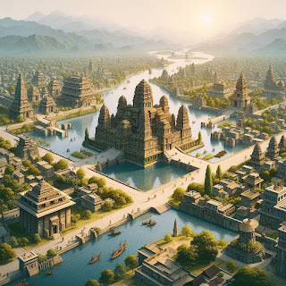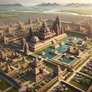 The central area was eight yojanas wide and twelveyojanas long (one yojana is appx. eight kilometers). The adjoiningregions were double in size. The city had eight main roads and sixteen large crossroads.By-lanes extended into the interior regions from seven main roads.