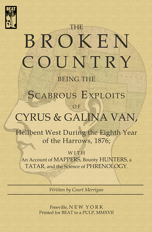 Our latest BEAT to a PULP release is a partnership with the talented Court Merrigan with one very looong title. You ready? Ok, here it goes: The Broken Country: Being the Scabrous Exploits of Cyrus & Galina Van, Hellbent West During the Eighth Year of the Harrows, 1876; With an Account of Mappers, Bounty Hunters, a Tatar, and the Science of Phrenology.Set in post-apocalyptic 1876, The Broken Country tracks the scabrous exploits of the outlaws Cyrus and Galina Van. The pair kidnaps a naïve, young scion and head west in pursuit of gold, glory, and respect. Along the trail they met Atlante Ames, a mapper who euthanized her own father and now seeks her twin brother, himself gone outlaw in the ravaged West. In cold pursuit rides the implacable bounty hunter Hal, who takes scalps in the name of Jesus Christ and the science of phrenology, and the contemplative Buddhist assassin Qa'un, paying off the bloodprice he owes Hal … bounty by bloody bounty. Cyrus and Galina's hard road west comes to a head in a dynamite-tossing, six-gun-blazing shootout at the old train depot in Laramie.