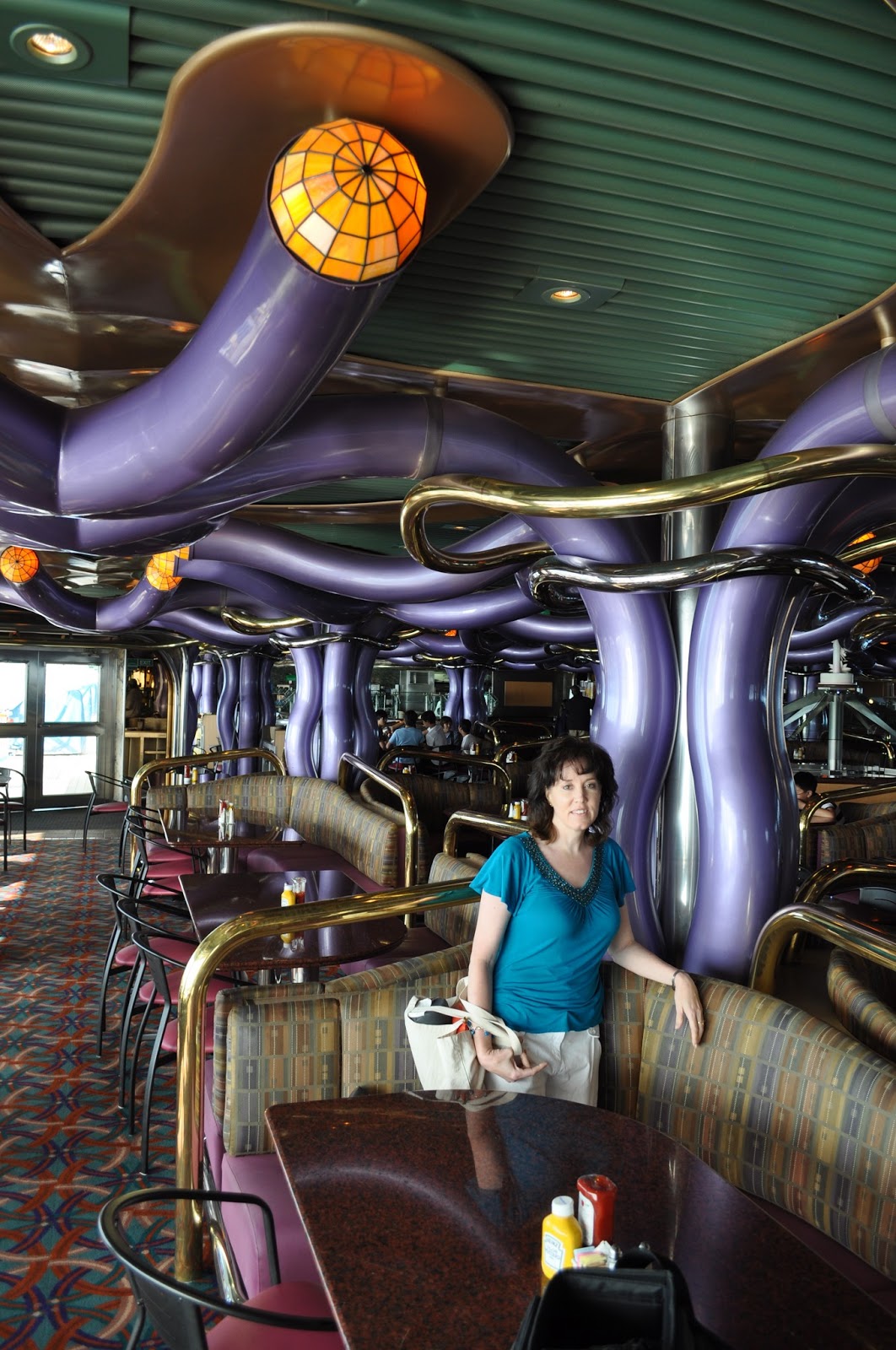 For some reason that isn't clear to me, Carnival decorated their dining room so that it looked like Ursula from the Little Mermaid was attacking the ship. Nothing says, "Dig in and eat!" like big purple plastic tubes. And if that's not classy enough for you, they added orange spiderweb designs to the end of the tubes. Maybe if you're really drunk, this all makes sense.