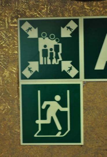 There were all sorts of these signs on the ship. I'm assuming there were no words on them because the sign makers wanted to add to the general confusion the signs communicated. Here you can see two different signs, side by side. The first is clearly warning you that ninjas may drop from the ceiling and surround your family.