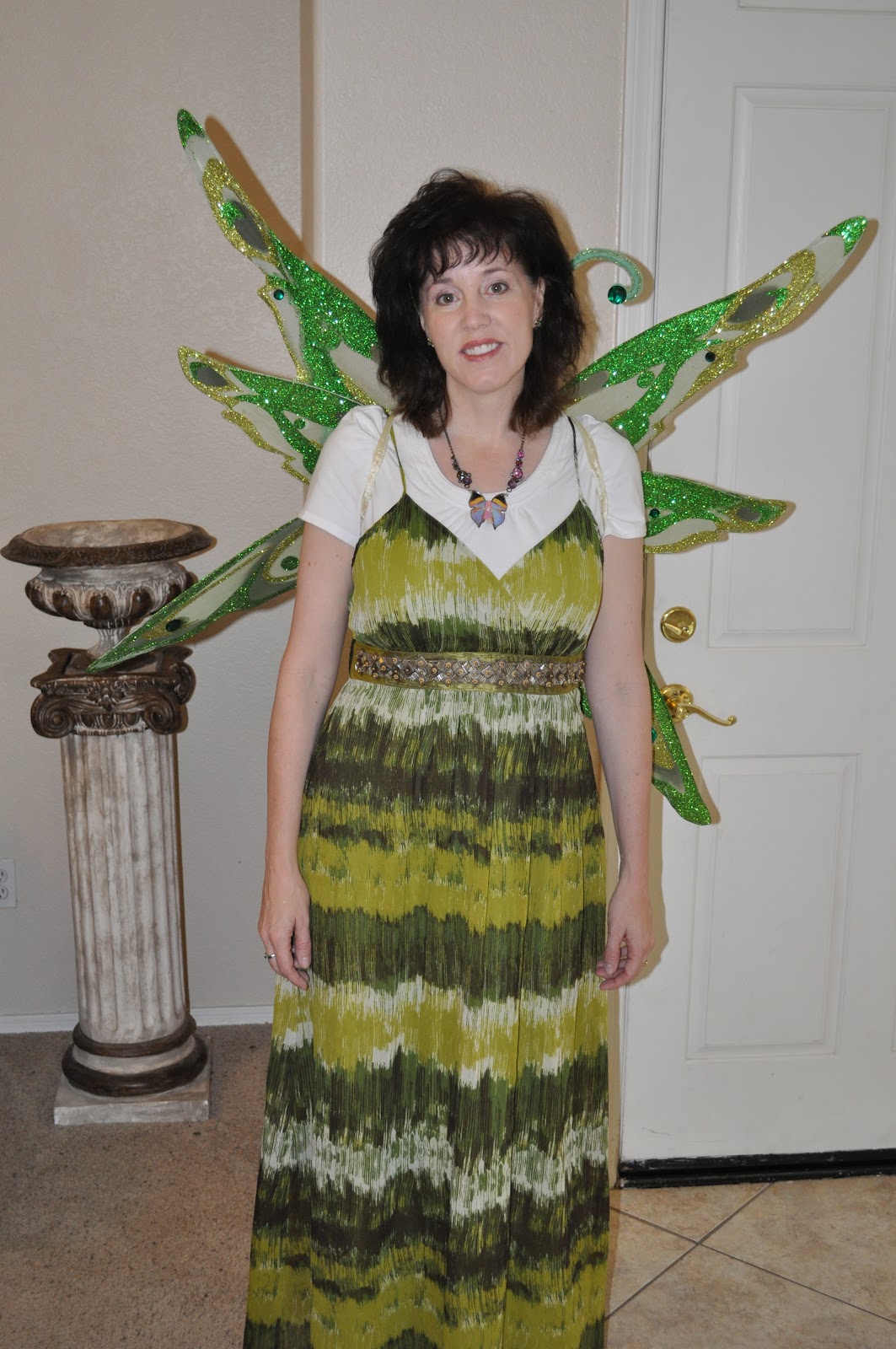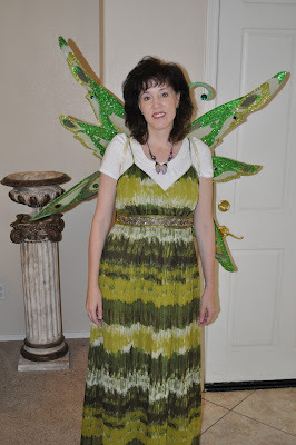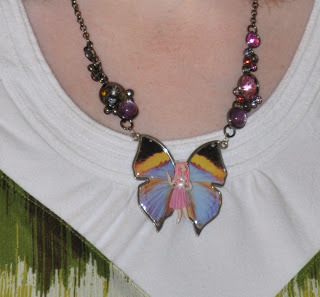 Here I am with my fairy wings, getting ready for my panel on the fair folk with awesome authors, Janni Lee Simner and Aprilynne Pike. Great panel and pretty well attended considering it was at the same time as William Shatner's panel. (It never fails; whenever I teach at a conference, my class falls at the same time as a class I want to go to.) But this is what made my outfit extra awesome. Author and jewelry maker Shelia Nielson made me a Chrysanthemum Everstar fairy necklace. Here is a closer view of it:
