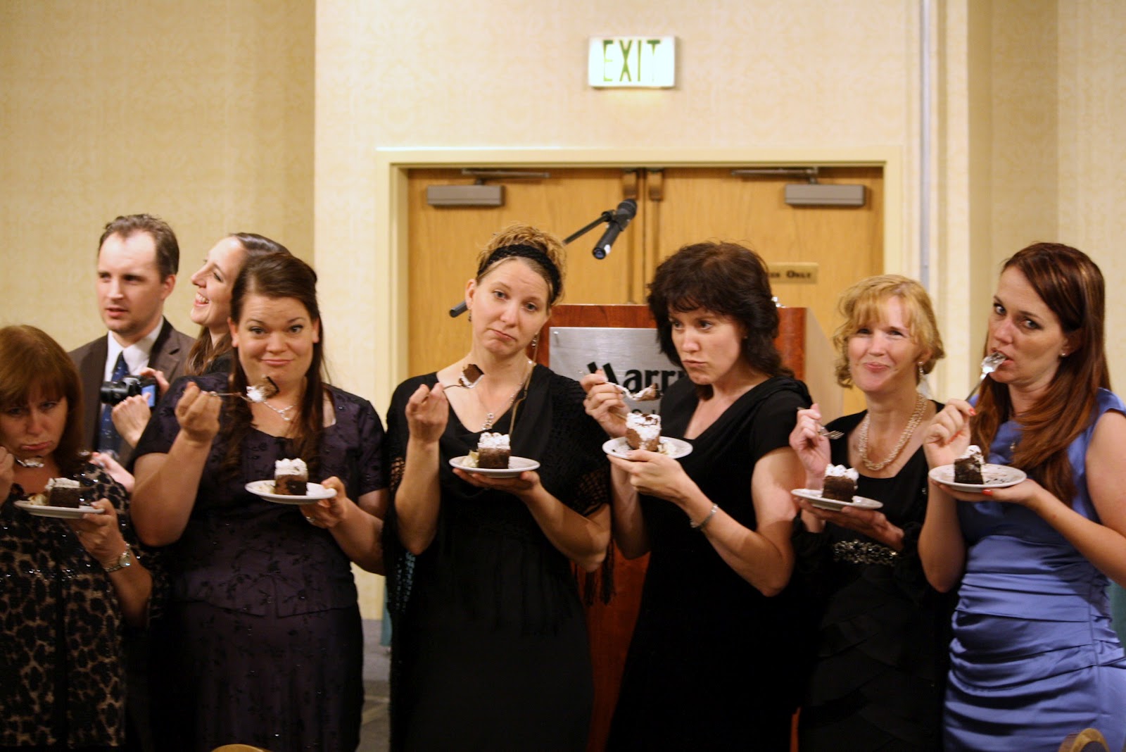And here's another picture where Melanie Jacobson joined us in the cheesecake circle. You can see Dan Wells is trying to sneak into the picture--because yes, we are that cool. But he is totally not part of our in crowd. True, he lost his category, but then he went and blew his photo op opportunity by winning best book. Whatever, Dan. Maybe you can join us next year.