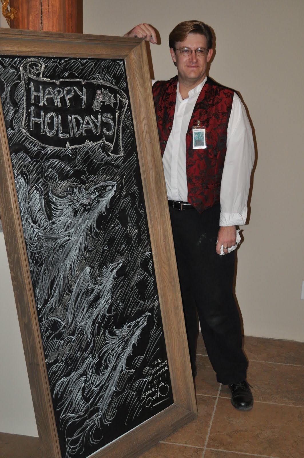 Here is a picture of James Owen and the chalk masterpiece he whipped up for the evening. Seriously, it only took him a few minutes to draw these dragons. Which seriously baffles my not-able-to-draw mind.