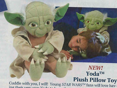 The catalog copy says Cuddle with you, I will! Judging from this picture, Yoda is also saying, "Hide under your bed, I will. Come out at night while you're sleeping, I will. Try to suck your brains out, I will."