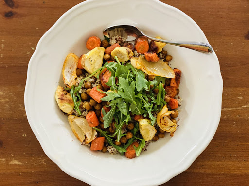 From Scratch Sunday Table – Roasted Chickpea and Root Veggie Quinoa Bowl with Arugula