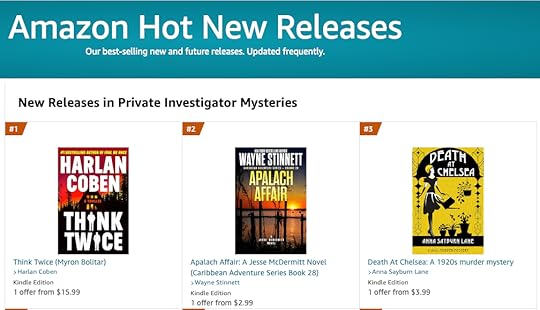 I’m truly thrilled by readers’ responses to Death At Chelsea. The reviews have been lovely, and I was especially excited to get my first ‘top three’ on Amazon in their Hot New Releases for private investigator mysteries.