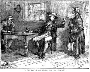Dickens doesn’t tell us exactly what Nancy does, but the description hints at prostitution. She has no police record, however, and is able to go to the magistrate court unrecognised to see Oliver’s trial for pickpocketing. It’s Nancy who comes up with a plan to kidnap Oliver off the streets. But she has a change of heart, protects the boy from Bill when he threatens to beat him, and eventually goes to Oliver’s benefactor to warn him of danger to the boy.