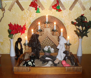 The photograph is of a crib set I made in pottery classes decades ago, and some of the animals were my children's contributions - the second Baby Jesus was made by Daniel, who was only two at the time.
