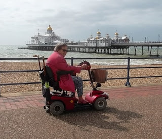 I only just caught the Friday Fictioneers plane myself this week, as I have been away for a few days with my mother, who is 94. She walks so slowly with her two sticks that we hired a mobility scooter, and one afternoon while she had her nap I took it for a spin myself. It was fun, but also an interesting experiment being a person in a wheelchair. Some peole moved politely out of the way, others completely ignored me! This is Mum bowling along Eastbourne seafront in a howling gale.