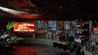 The cave where he sheltered as a young shepherd is now a shrine which people visit to ask Hermano Pedro's help or to give thanks, and to light a candle. The cracks in the cave walls are stuffed with handwritten prayers, including one of mine.