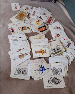 Such excitement this morning to find that Rochelle has used my photo for the prompt - until I saw the name isn't mine. Someone else got the credit :( Moving Mum to a Care Home entailed clearing a lot of stuff she'd not seen for decades, which included this collection of Jokers, amassed over her 98 years of life. I guess they might be worth something but I've no idea where to start looking, so they sit in a drawer in my house, waiting for my kids to throw out when I've gone.