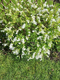 I spent a while this morning clearing up the debris from yesterday's strong winds, which blew over a plant stand in my garden, leaving plants and compost everywhere. Fortunately my exochorda - otherwise known as String of Pearls - survived. It was a stick when I arrived here over four years ago, and when it resisted being dug up I gave it an ultimatum which it took to heart. Now it is the first shrub to brighten my garden as the spring bulbs begin to fade.AND a belated Happy Easter to you all.