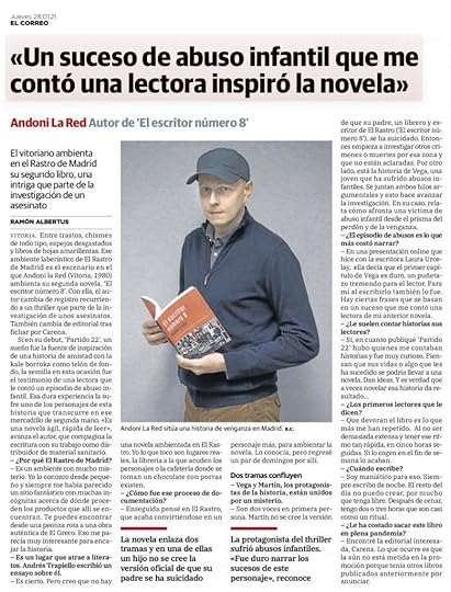 Conocí a Andoni La Red con su primera novela Partido a 22, una historia de amistad, violencia y amor en el contexto de la Kale Borroka de la Vitoria de los años 90. Ahora, podemos disfrutar de su segunda novela que, curiosamente, también lleva un número en su título: El escritor número 8. Esta vez, Andoni nos lleva al Rastro de Madrid para descubrir todos los secretos tras la misteriosa muerte de un escritor del rastro.