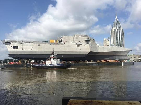 The future Savannah (LCS-28) is floated down the Mobile River on Sept. 2, 2020, just days after it was christened at the Austal USA shipyard. Austal USA photo.