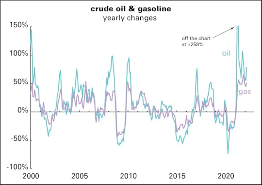 The graph below makes the point visually. Oil and gas prices move almost exactly together, with gas moving less than oil. A simple regression on these stats shows that for every 10% change in the price of oil over the course of a year, the price of gas moves by about 4.5%. The relationship hold in both directions. That 45% ratio almost exactly matches the percentage changes in the previous paragraph. And the relationship holds if you take the analysis back to 1975 instead of beginning in 2000.