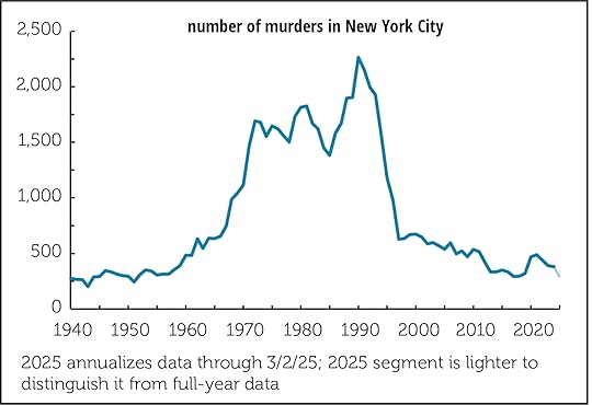 We’re only a couple of months into 2025, but the stats so far this year are looking even better: murders are down 25% from the same period last year (ending March 2, to be precise). If this trend holds for the rest of the year—a big if, for sure—there will be 288 murders, which would be the lowest annual death toll since 1951.