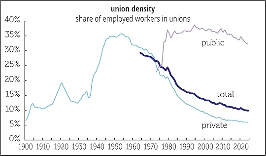 Since 1965, union density has risen only five times from one year to the next; it’s fallen in 49. Although one has to take stats from over a century ago skeptically, it looks like the private sector union share today is lower than it was in 1900. The public sector is back to 1977 levels.