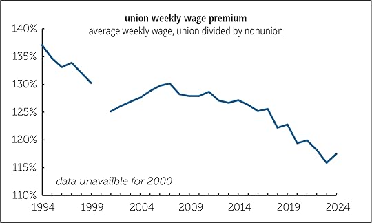 A reminder why unions are important: the raise wages. The so-called union premium, the amount by which a union wage exceeds a nonunion wage, has been declining, but it was still 17% last year (graph below). Barry Hirsch and David Macpherson (see link below) adjust the premium for variation in industry, occupation, and demographics to isolate a pure union effect. Their data for 2024 isn’t out yet, but the adjustment does take a chunk out of the union premium, lowering it by about a third. But the premium is still a nontrivial 12% over the last five years.