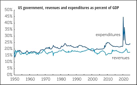 Aside from surges around recessions (mid-1970s, early 1980s, 2008–2010) and the covid pandemic, the expenditures line has been essentially flat for the last 40 years. A serious problem, if you’re concerned about debt and deficits—I’ll address that some other time—is that, aside from the late 1990s, revenues haven’t kept up with spending since around 1970. They took hits from George W. Bush’s tax cuts after 2001 and from Trump’s after 2017, but the revenue line has also been essentially flat for decades, just at a level well below spending. Funnily, the people most concerned about debts and deficits—rich people and those who shill for them—are the ones most opposed to paying taxes.
