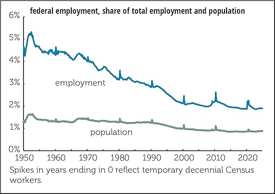 Both are in downtrends. In 1950, back when America was Great, federal employment was 4.4% of total employment and 1.3% of the population. In 2024, it was 1.9% of employment and 0.9% of the population. Both are exactly the same as when Trump took office—there was no surge under Biden. Both are well below where they were when Reagan took office.