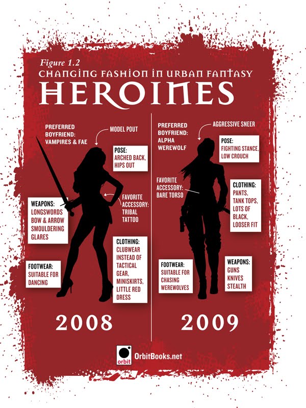 The folks at Orbit Books have put together a feature on changing fashion in urban fantasy covers. I think Merit--who wouldn't wear a mini-skirt or stilettos unless her life depended on it (or if Ethan made her, which is pretty much the same thing--is a much better fit for '09 than '09. Leather FTW!