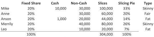 In this example, the team created an even split at the outset of the venture. Things didn’t move along as planned and the team applied the Slicing Pie retrofit formula to see where equity should be at this point in time. Mike is a skinny Grunt. He has less than he deserves. So is Merrily. Anson and Leo are fat Grunts because they have more than they deserve. Anne has the right amount, coincidentally.