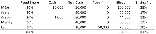 So, let’s pretend that of our two fat Grunts, Anson is cool with the switch to Slicing Pie, but Leo is a dick and won’t budge. You can still switch to Slicing Pie, but you have to pay Leo off with slices: