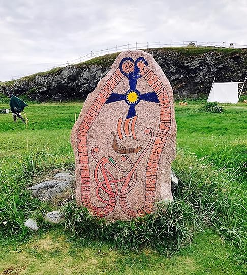 This colourful Viking rune stone (and the contemporary Norseman in the background) reside at the Norstead Viking Village at L'Anse aux Meadows, Newfoundland.