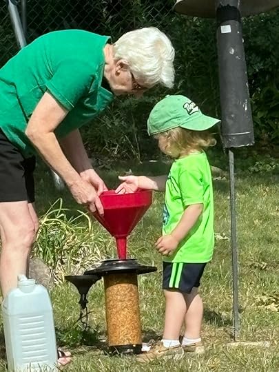 Grandparents carry the jug to the bird feeder hanging on the wrought-iron plant stand. Ben carries the funnel. Some...