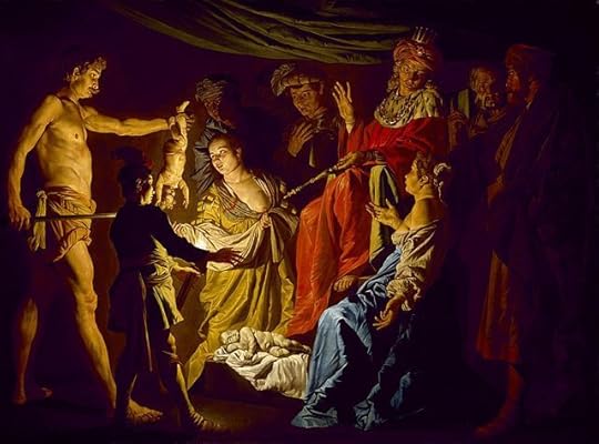 I swear, though most paintings like the one above show no such thing, that the lithograph with that particular story showed the guard holding half a baby, with the other half lying on the floor in a pool of blood.