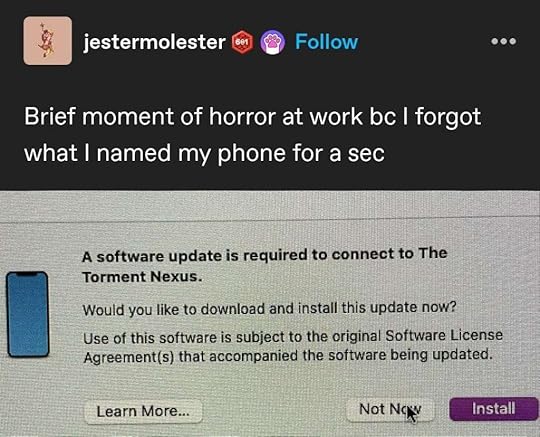 Anyway– “you magnificent bastard, I read your book!” I am better. Still extremely far from well, but you know? I’m starting to maybe believe hypothetically I might be well again some day.