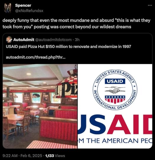 If you have missed it, I can’t even track down all the tweets, but let’s say that for the last week or so, Elon Musk has been catching USAID, skinning it, anatomizing it, and hanging its ugly, diseased entrails out for the world to see.