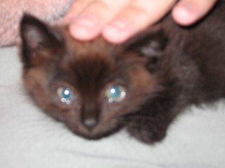 Above, she was only three weeks old, and just recovering from the massive eye infection that caused her mom to bring her to the humans, and ended up with us bottle raising her.