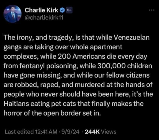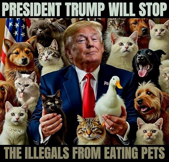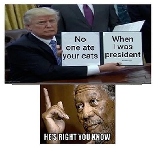 But one very brief foray into twitter this morning brought me across a guy screaming (and I’m doing this from memory and for comedy, so wording is not only not exact but exaggerated): “Damn you you maniacs and your immigrants eating pets memes! You caused Trump to ...