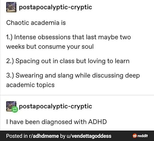 Or perhaps staring blankly out the window. Who knows. Or half and half. Honestly, the ADD becoming weaponized...