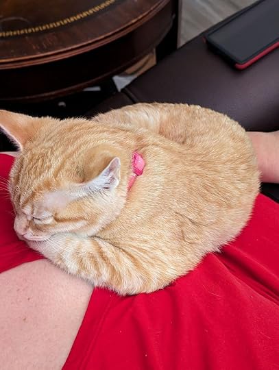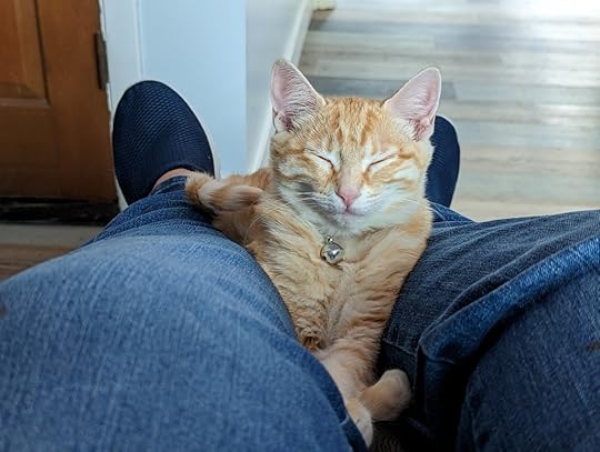 Picture of Helena on my knees from last week. She nestles there, past my laptop.