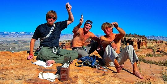 Rob Masters, Brian Shelton, and CJ Sidebottom toast 1911 pioneering climber John Otto on the summit of Independence Monument at Colorado National Monument. Photograph © Stewart M. Green9. Climbing Gives You Great FriendshipsClimbing reflects the dichotomy of human experience. On one hand, I must climb alone, using my climbing skills and experience to reach the top. On the other hand, I am a member of a team. I have a partnership, a strong bond, with a climbing partner. Climbing is about partnership and friendship. As climbers, we work together and in doing so, we reach our summits and goals together. We look out for our climbing buddies, make sure they are safe, and they in turn do the same thing for us. They check our knots, give us belays, and encourage us to climb higher. As climbers we discover that life’s great adventures are to be shared together—we share life, joy, and adventure.