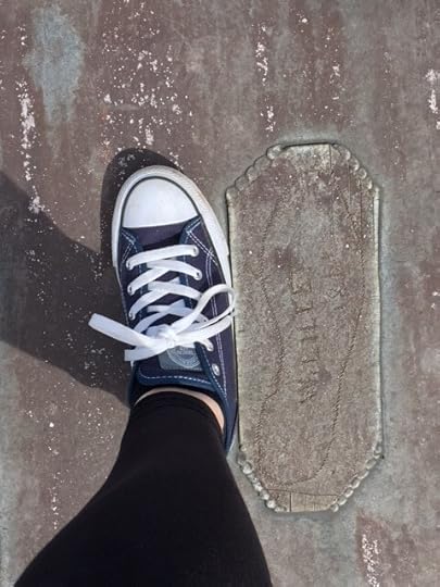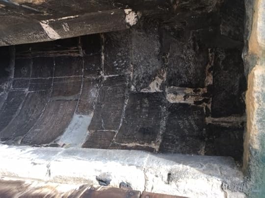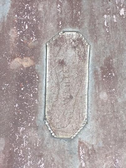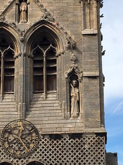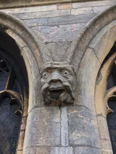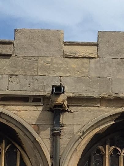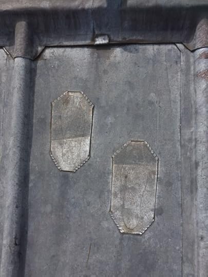 The church warden was an excellent guide and told us so much about the building including the fact that it costs approx £500 per day to maintain etc. I thought at this point, all very enjoyable and useful for my story but then we were asked did we want to go up onto the next part of the church which involved climbing up a very shaky metal ladders which was not made for short legs and when you get to the top and the stone gullies dip about a foot – but hey ho, it’s go over or go down. This latest terrifying experience over, we look again at the wonderfully carved stone faces and various other interesting metal footprints (see pics) and then we are asked if we want to look at the other side. ((At this point Peachy I would have thought you would have answered no thank you but…)) yes, I (we) said yes alright!