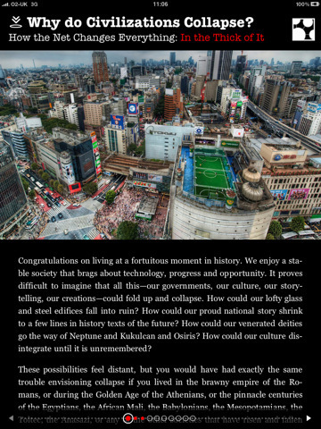 After his SALT talk for Long Now called Six Easy Steps to Avert the Collapse of Civilization, David Eagleman mentioned his interest in writing an entire book on the subject. Kevin Kelly suggested he make it an iPad book, though they both acknowledged they didn't really know what that meant at the time. Eagleman spent the intervening months working it out and has just announced release of the result:
