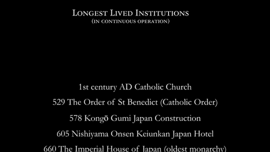 I’ve been collecting data on all of the longest lived institutions in the world. As you look at these, there’s a few things that stick out. Notice: brewery, brewery, winery, hotel, bar, pub, right? And also notice that a lot of them are in Japan. There’s been a rough system of government there for over 2,000 years (the Royal Family) that’s held together enough to enable something like the Royal Confectioner of Japan to be one of the oldest companies in the world. But there’s also temple builders and things like that.