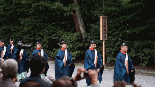 As we took photos, a large group of priests and press started lining up. We were ushered over to the gift building area and held back by white gloved security personnel. It was a bit comical as they did not seem to know exactly what to do with us. Since this ceremony happens only every 20 years, it is unlikely that any of the staff were present at the last occasion: while this is one of the oldest events in the world, it is simultaneously brand new. It was very apparent that none of the ritual acts were performed for the audience. All of this ceremony was designed for the benefit of the Kami spirits, not for people’s entertainment, and much of what we saw were glimpses through trees from a distance. While it was hard to see everything, we all agreed that this perspective made the tradition much more magical and interesting than if it had all been laid bare.